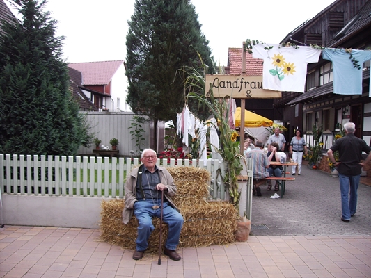 Hier hatten wir zusammen mit dem Theaterverein im Hof von Herbert Beinert in der Ortenaustraße ein Zelt aufgebaut. Wir bewirteten die zahlreichen Gäste mit „Drescheresse“ ( Schäufele mit Kartoffelsalat), &bdquo1Gsunds usem Garde“ (Salatteller) und Kaffee und Kuchen.